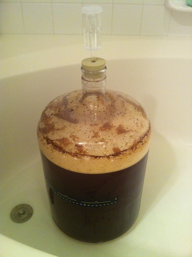 After transferring to the fermenter and pitching the yeast, I put the fermenter in the bathtub with some water in it. This beer should ferment around 64F, and it seemed like the bathroom was little bit too cool. It was around 61-64. I decided to empty out the water, and it still stayed around the same. Fermentation didn't start very quickly. There was bubbles in the airlock, but it didn't really form any krausen for a few days. Eventually it started, and the higher gravity of this beer compared to my others must have made it ferment more vigerously, as one day when I got back from work I noticed a little bit of the leftover krausen halfway up the airlock.